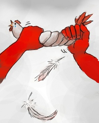 도살 방식은 잔인하다. 우선 닭을 거꾸로 매달고 수조에 머리를 처박아 전기 충격을 가한다. 이때 닭은 마비 상태가 되지만 의식은 여전하다. “곧바로 기절시키면 고기 맛이 떨어질 우려”가 있어 적정 수준의 전기만 흘려보내서다. 이렇게 정신이 말짱한 닭들은 다음 단계에서 목이 잘린다. 마지막에는 펄펄 끓는 물이 기다린다. 가끔 도살 라인 속도가 너무 빨라 살아 있는 닭이 물에 들어가기도 한다. 타이슨푸드 사 도살장에서 일했던 버질 버틀러는 그 아수라와 같았던 현장을 이렇게 묘사한다.