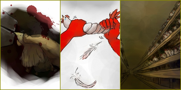 "산 채로 튀겨지면서 퍼덕거리고, 비명을 지르고, 발버둥치고, 눈알이 문자 그대로 머리에서 튀어나와 떨어집니다. 나중에 그런 닭을 꺼내 보면 뼈가 아스러지고, 몸의 부위가 군데군데 없어져 있습니다. 물탱크 속에서 얼마나 절망적으로 몸부림쳤으면 그럴까요?"