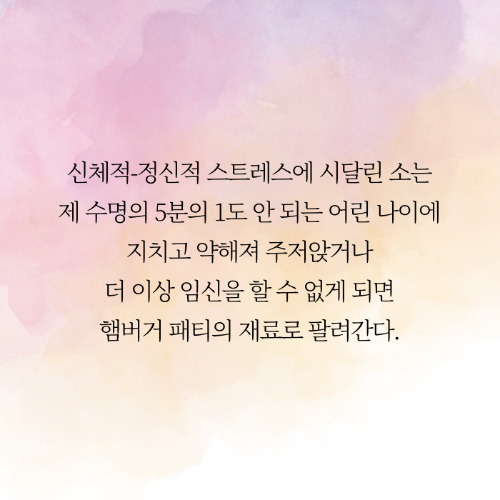 신체적-정신적 스트레스에 시달린 소는 제 수명의 5분의 1도 안 되는 어린 나이에 지치고 약해져 주저앉거나 더 이상 임신을 할 수 없게 되면 햄버거 패티의 재료로 팔려간다.