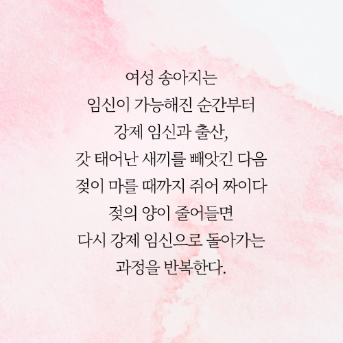 여성 송아지는 임신이 가능해진 순간부터 강제 임신과 출산, 갓 태어난 새끼를 빼앗긴 다음 젖이 마를 때까지 쥐어 짜이다 젖의 양이 줄어들면 다시 강제 임신으로 돌아가는 과정을 반복한다.